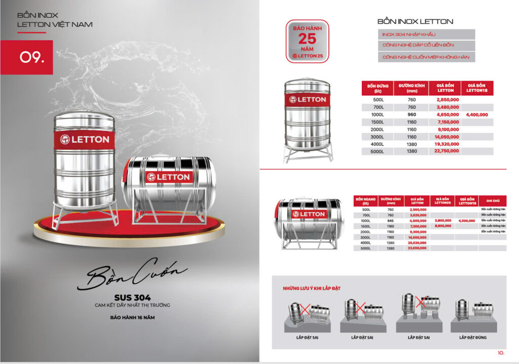 Bồn nước Letton không chỉ nổi bật về chất lượng mà còn có mức giá cạnh tranh so với các sản phẩm cùng loại trên thị trường. Dưới đây là bảng giá tham khảo: